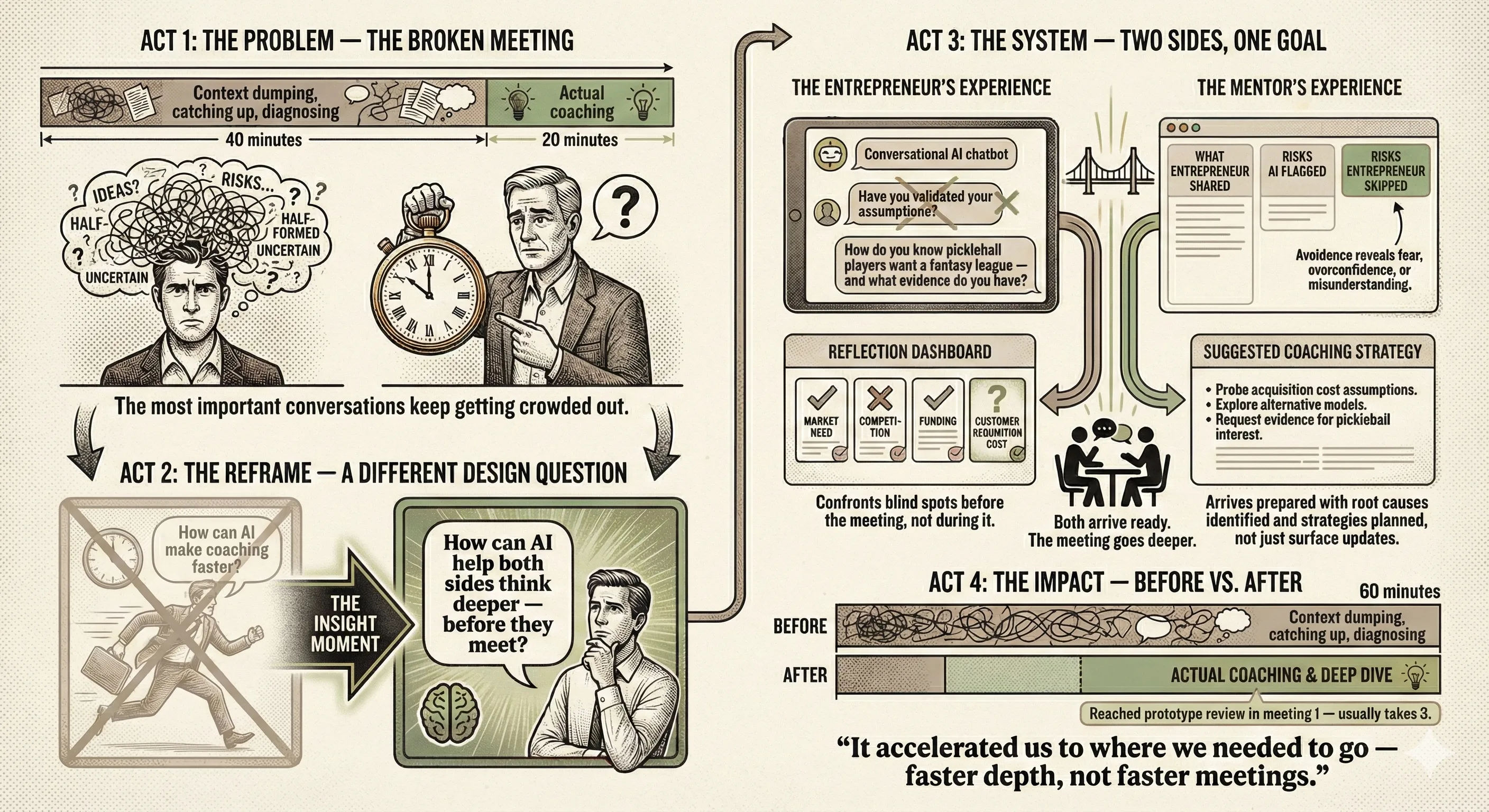 The insight that changed my approach: Early on, I assumed the goal was efficiency: shorter meetings, faster updates, less friction. What I discovered through interviews and prototype testing with mentors and entrepreneurs was different. The problem wasn’t the meeting itself. It was that neither person had done the hard cognitive work before walking in the door.